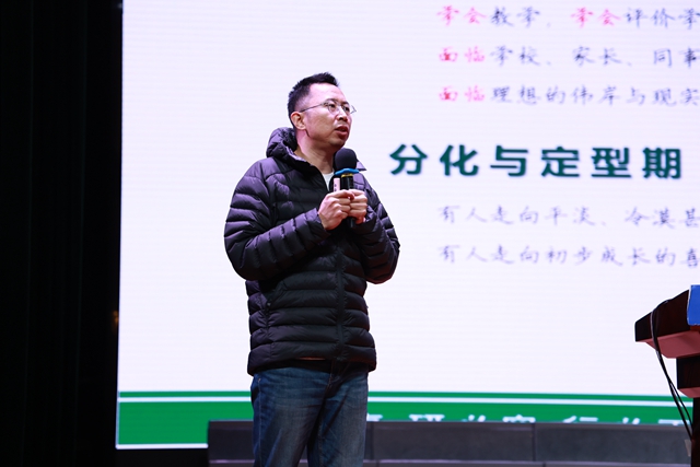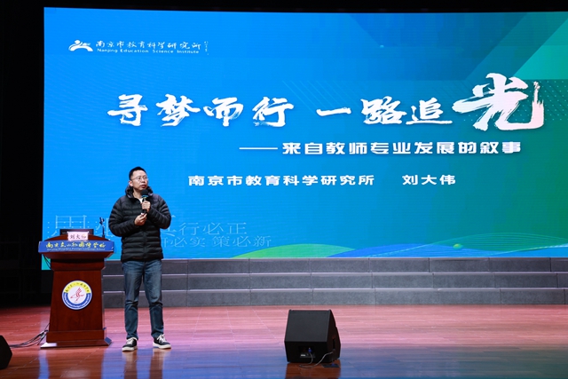 随后,进入专家讲座环节。南京市教科所刘大伟所长带来《寻梦而行 一路追光——来自教师专业发展的叙事》专题讲座。刘所长将教师发展比作“隧道中探寻光的旅程”,通过“遇到光”“做光的传递者”“什么是光”三个篇章展开分享。在“遇到光” 部分,他以教育名家榜样为例,传递“关爱人、搭台子、给任务”的育人理念;“做光的传递者”篇章中,结合名特优教师成长案例,提出教师需通过“诊断、规划、实施”突破职业瓶颈,并介绍南京“千计百方”人才培养计划;“什么是光”部分则引发共鸣,强调内心梦想与外在驱动的力量,鼓励教师坚守教育初心。