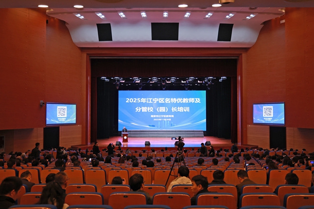 为持续加强全区名特优教师队伍建设,深化规范管理,明确责任担当,助力江宁教育强区建设,2025年11月30日上午,江宁区名特优教师及分管校(园)长专题培训在我校青春剧场举行。江宁区教育局蒋开华局长、普教科科长尚剑锋、人事科副科长王蜜、普教科副科长杨猛、教师发展中心校长宋熠本次活动。江苏省特级教师、历届市学科与德育带头人及优青、中小学教学副校长、幼儿园业务园长等骨干力量,以及教研室、教师发展中心全体教师齐聚一堂,共赴教育盛会。