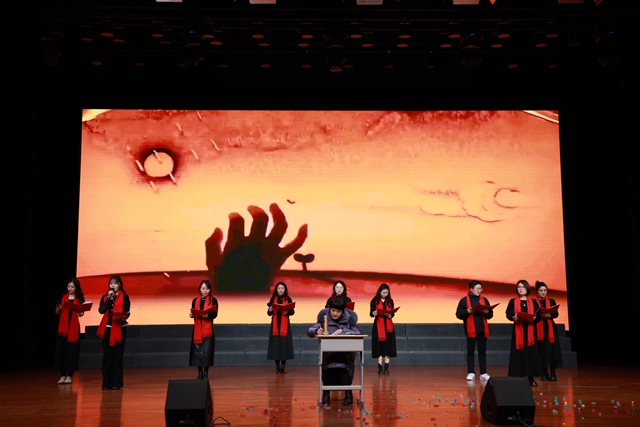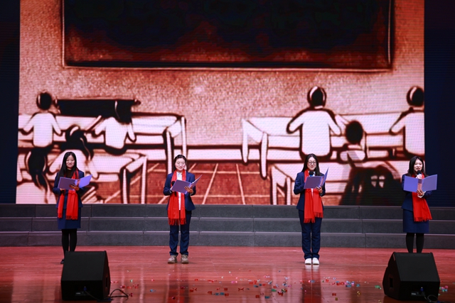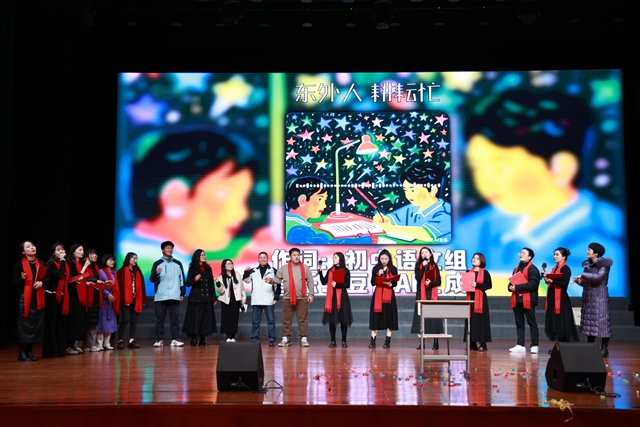 语文组深情演绎了情景朗诵合唱《如果你写老师》。节目将朗诵、情景表演与合唱巧妙融合,以真挚动人的语言和旋律,描绘了教师日常工作的点滴,诉说了对教育事业的忠诚与热爱,引发了在场每一位教育工作者的深深共鸣。