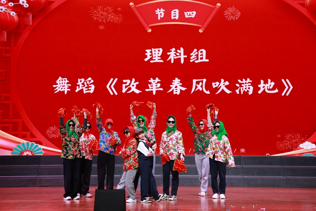 理科组则带来了创意十足的舞蹈《改革春风吹满地》。他们巧妙编排,将网络流行元素与学科特色结合,舞步幽默诙谐,展现了理科教师严谨之外风趣活泼的一面。