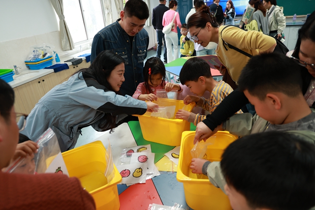 演出结束后,42支队伍、6条专属路线同步开启,萌娃们在老师和学生志愿者的带领下畅游校园、体验项目、打卡留念。