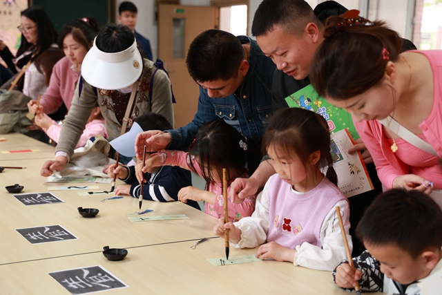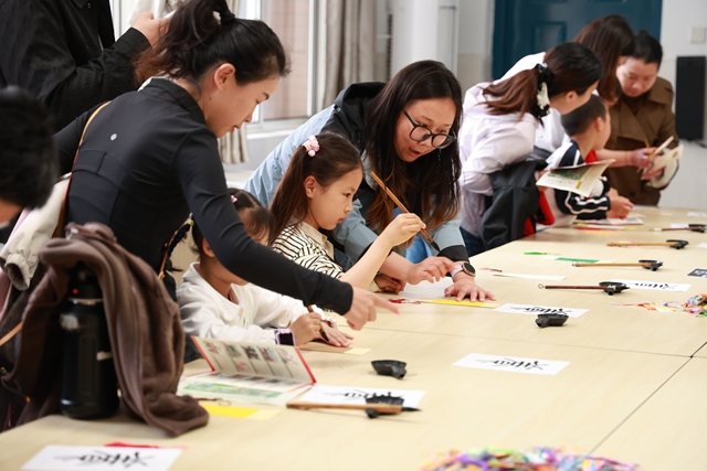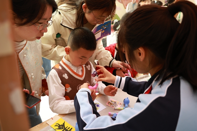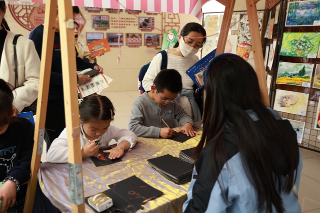 执笔书 “养” 书法体验,一笔一画感受汉字之美;词语接龙妙趣横生;东外扎染工坊,巧手创作,传统文化浸润童心。