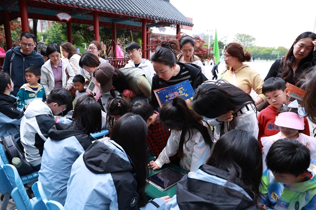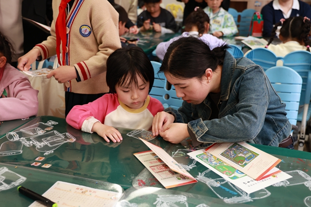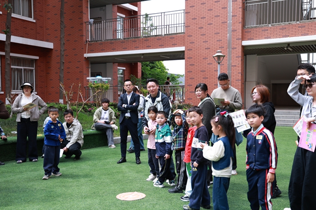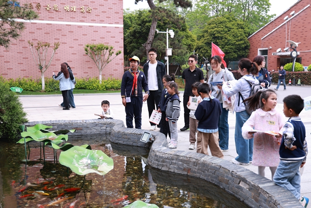 学生志愿者用英文、中文介绍校园十景,萌娃们认真聆听、打卡盖章,在双语氛围中感受校园文化底蕴。