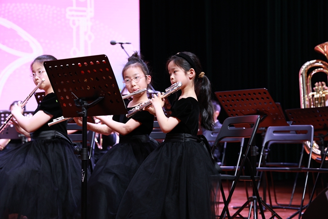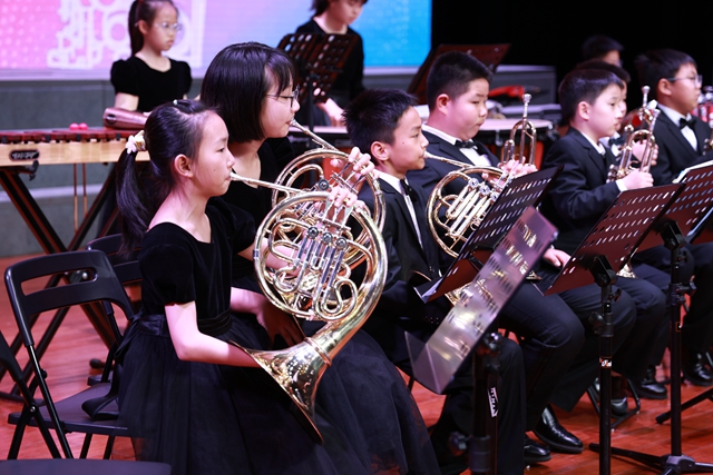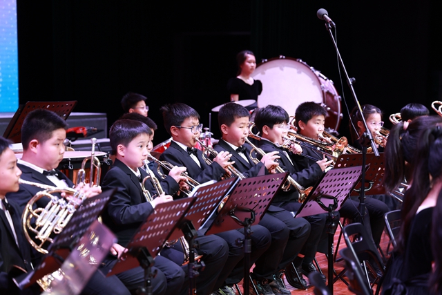 演出伊始,小学低年级团率先登场,以恢弘激昂的《蒙特高湾》《皇家进行曲》拉开帷幕。稚嫩的脸庞上满是专注,灵动的指尖流淌出铿锵旋律,瞬间点燃全场。