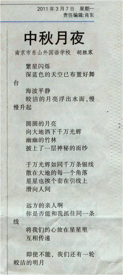 2011年3月7日,这首诗被作为一等奖作品代表选登在当日的《江苏教育报》上。