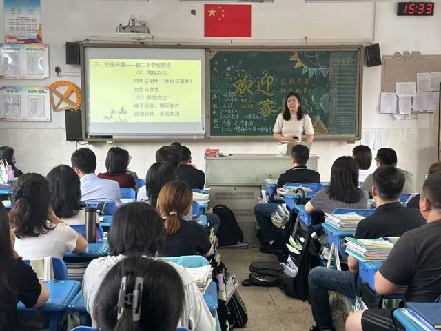 下午2时,家长会在年级组长朱林霞老师的主持下拉开帷幕。出席会议的有初二年级分管校长杨善明、年级分管主任曹丽萍及全体家长。朱老师代表年级组向家长们的到来致以热烈欢迎,强调“家校聚首是为了共同守护孩子的成长之路”。
