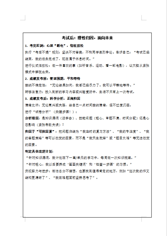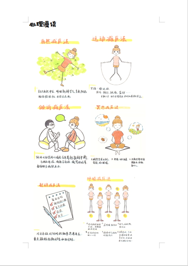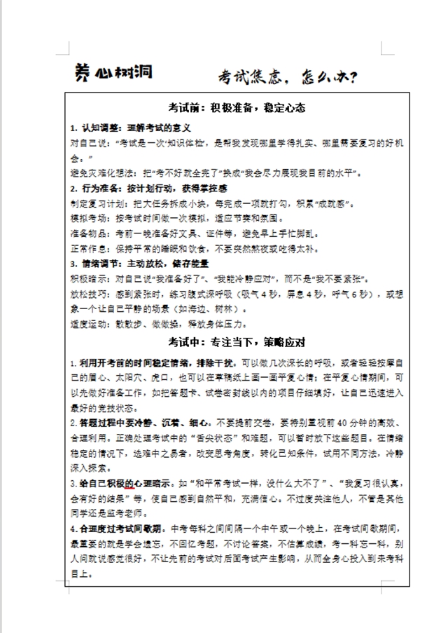 同时,本期校园心理小报,以图文结合的形式呈现关于考前心理调适的相关内容,涵盖呼吸放松法、积极自我暗示短句、考场应急心态调节技巧等实用干货,搭配暖心鼓励话语,逐班发放给学生,人手一份,助力大家在课余自主调适心理状态,为备考注入正向能量。