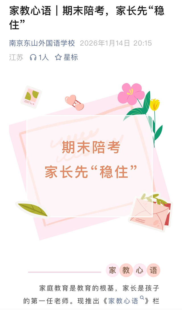为构建家校协同心理支持体系,心理教师团队通过致家长一封信、入户家访等形式,打通家校沟通壁垒。在学校微信公众号“家教心语”栏目面向全体家长发布《考前家庭教育心理指南》,普及考前亲子沟通技巧、焦虑情绪识别方法,引导家长营造轻松和谐的家庭备考氛围,以包容鼓励的态度陪伴孩子应对考试。