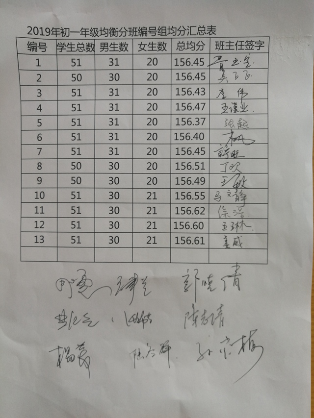 为了确保均衡分班的顺利实施,学校提前制定了完善的均衡分班方案。今年新初一共招收13个班录取新生668人。8月15日学校认真组织了学生分班摸底调研,封闭式阅卷工作。随后按照语数外三门成绩的总分,同时兼顾男女生比例的均衡,进行蛇形分班。13个教学班总均分班级差在0.5分以内。新初一13个班的班主任以及各学科的教师的分工安排,根据新老、性别等情况均衡配置,确保每个班级师资力量均衡,没有人为刻意的“重点班”、“资优班”。
