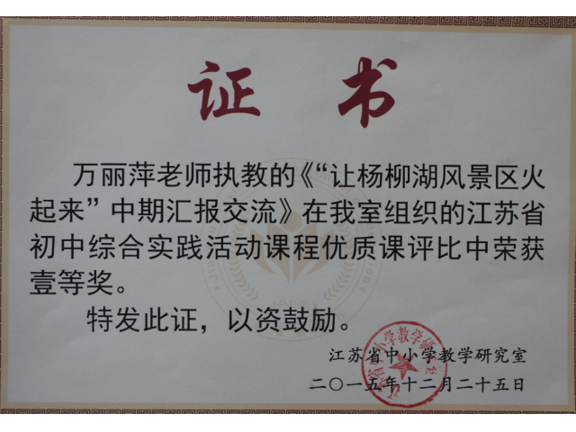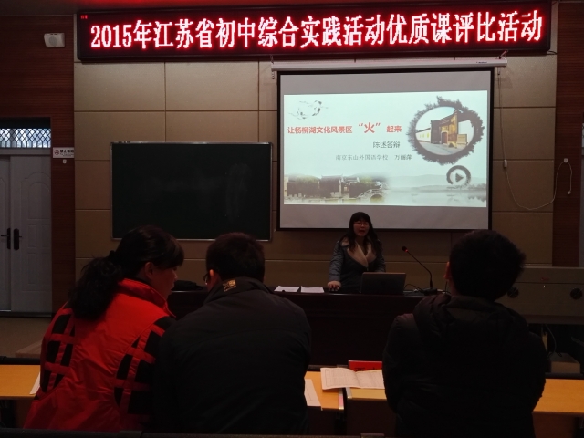 在12月1-2日举行的2015年江苏省初中综合实践活动优质课评选中,代表南京市参赛的我校万丽萍老师执教的《让杨柳湖文化风景区“火”起来——中期汇报交流》一课,以其新颖的教学设计,浓郁的学科教学特色,积极的师生活动,富有成效的成果,精彩的答辩,获得了评委和听课老师的一致好评,最终荣获江苏省一等奖。