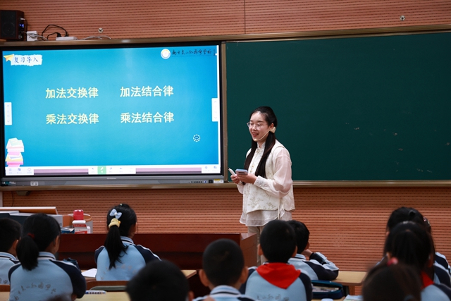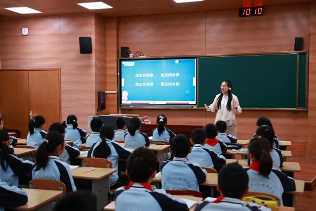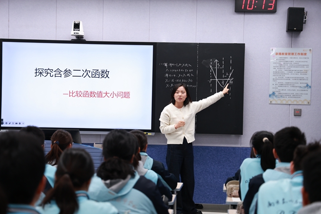 课堂观摩环节是本次交流的核心。初中和小学校长们分赴不同学段课堂,近距离感受我校常态课堂的教学魅力。在第二报告厅,章丽老师为四年级学生带来《乘法分配律》数学课,生动的教学设计、互动的课堂氛围,展现了小学数学教学的趣味与实效;录播教室内,杜淋老师围绕初三数学《含参二次函数比较大小》展开教学,精准的知识讲解、严谨的逻辑推导,彰显了初中数学教学的深度与专业性。两节常态课充分体现了我校扎实的教学功底与高效的课堂模式,赢得了来访校长们的认可。