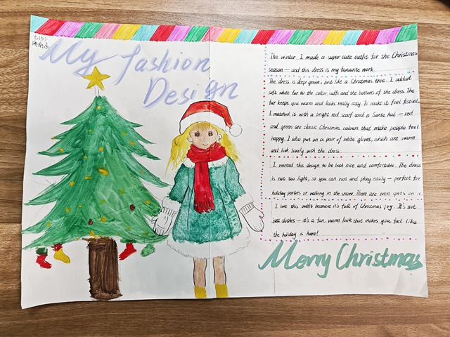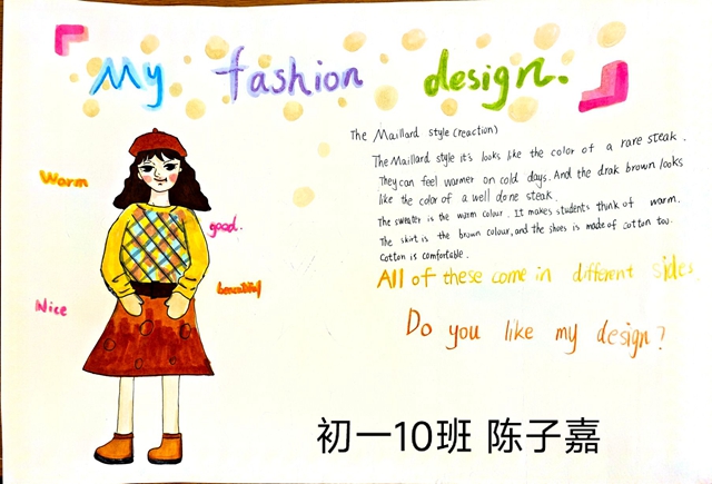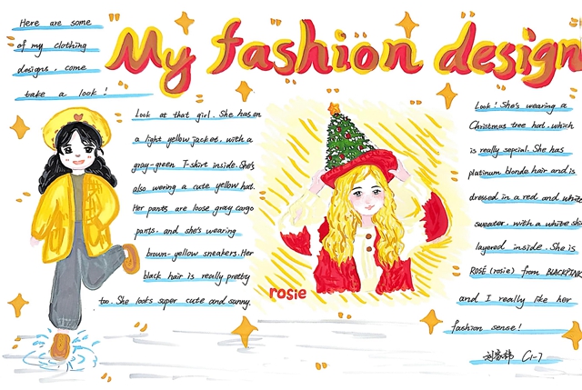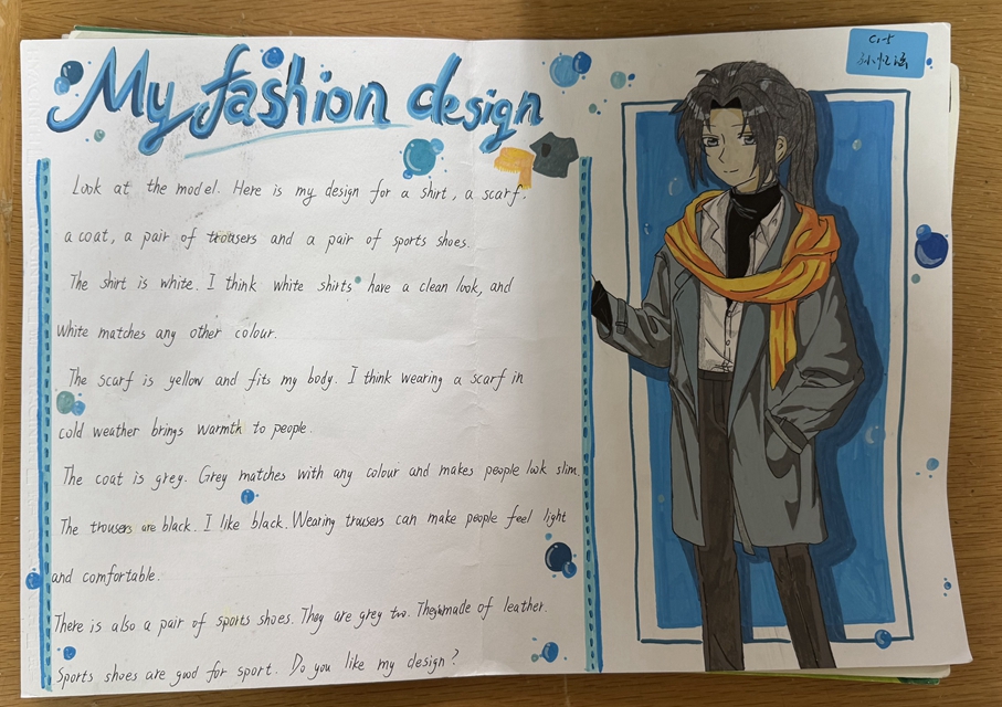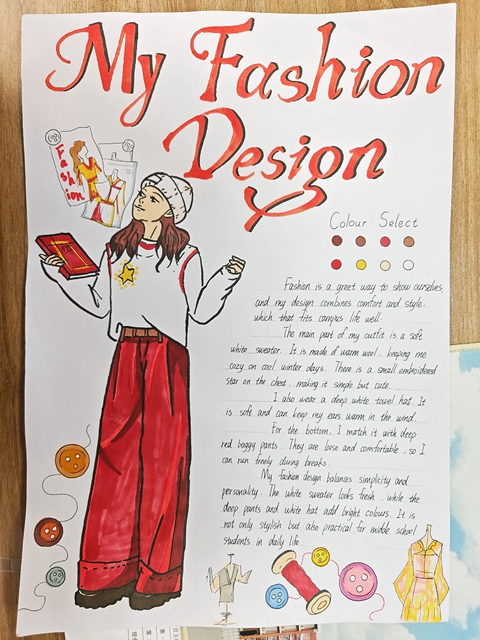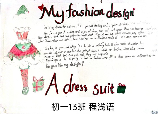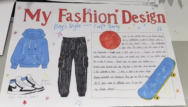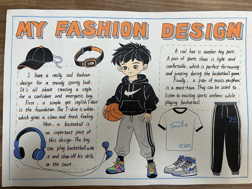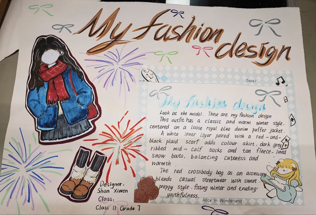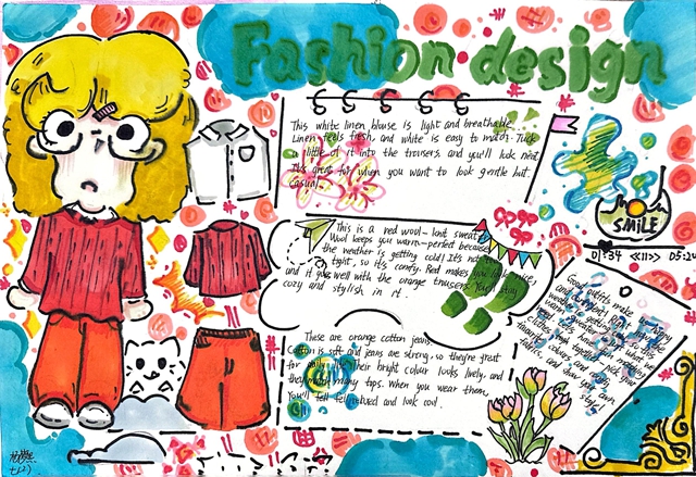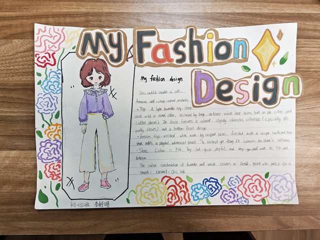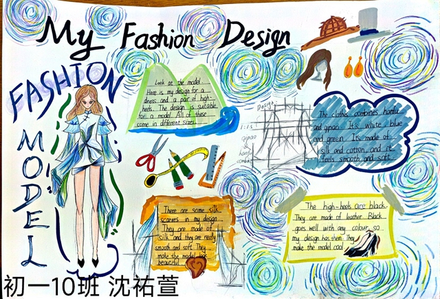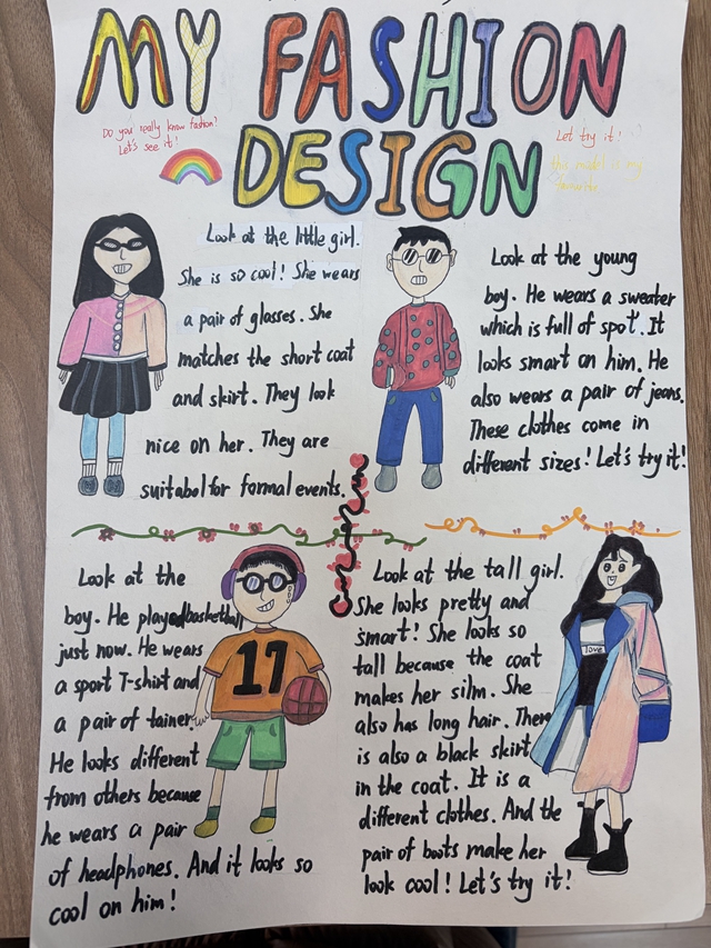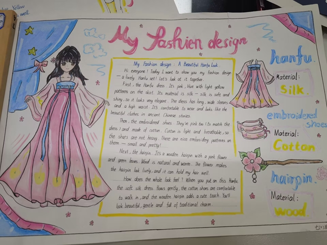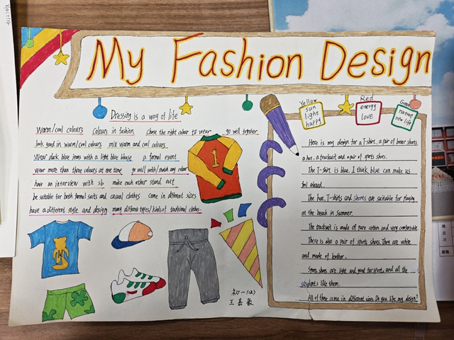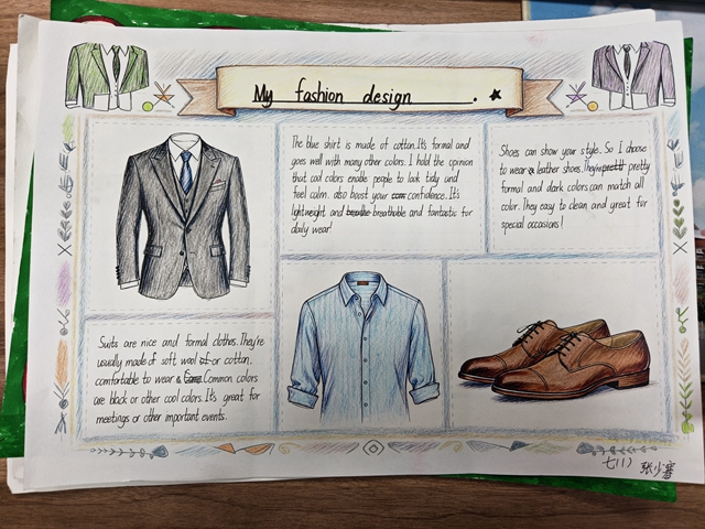 与此同时,本次英语节还开展了以My Fashion Design为主题的英语手抄报比赛。同学们围绕“我的时尚设计”这一主题,化身小小设计师,将天马行空的时尚构想落于笔尖。