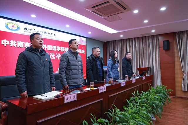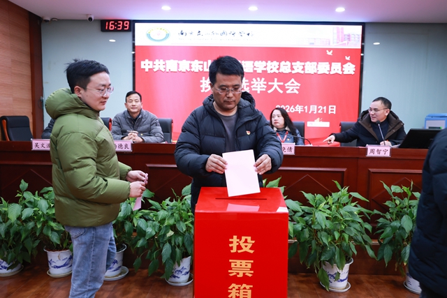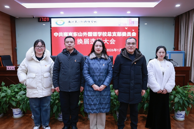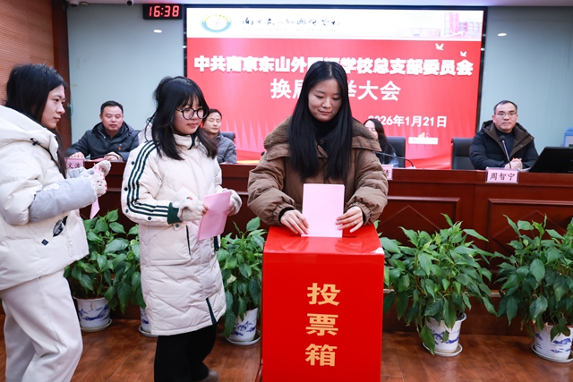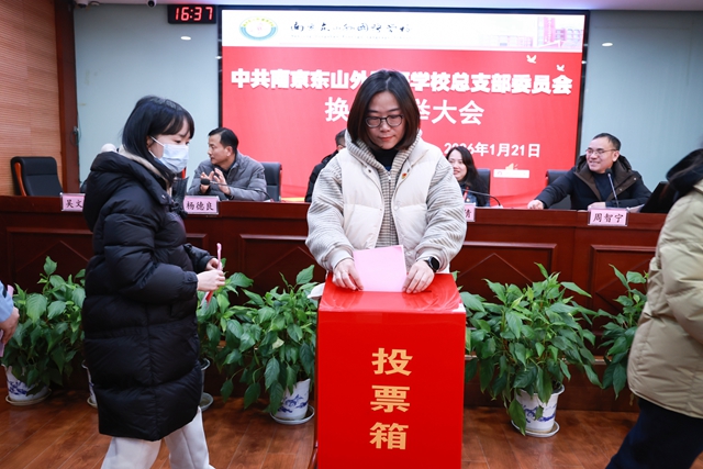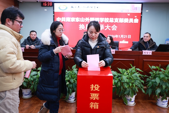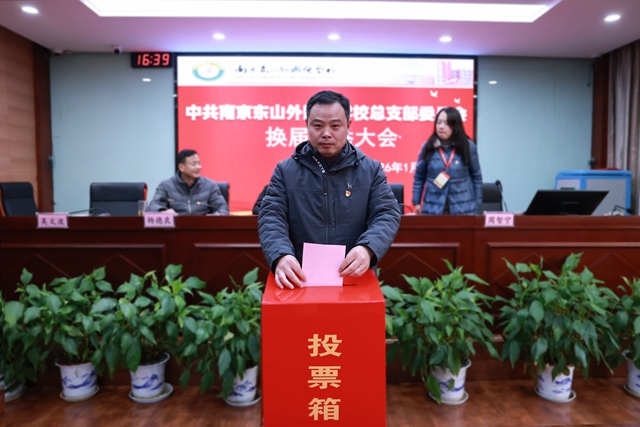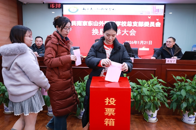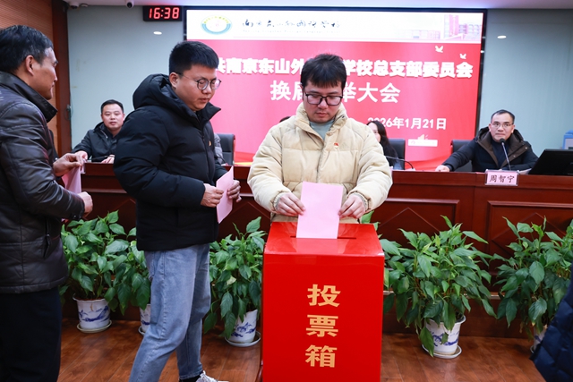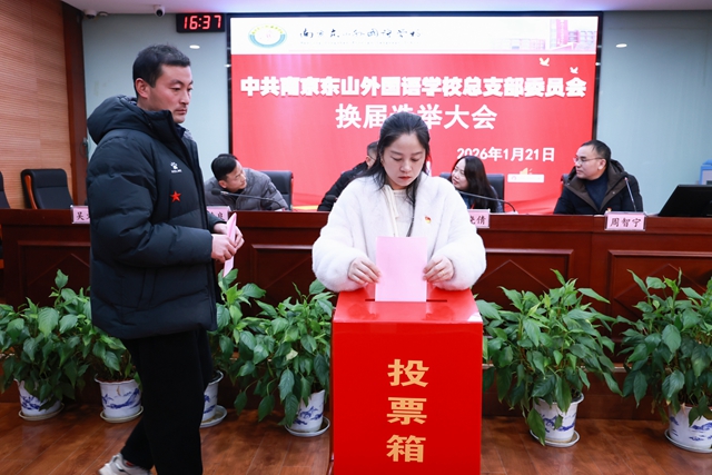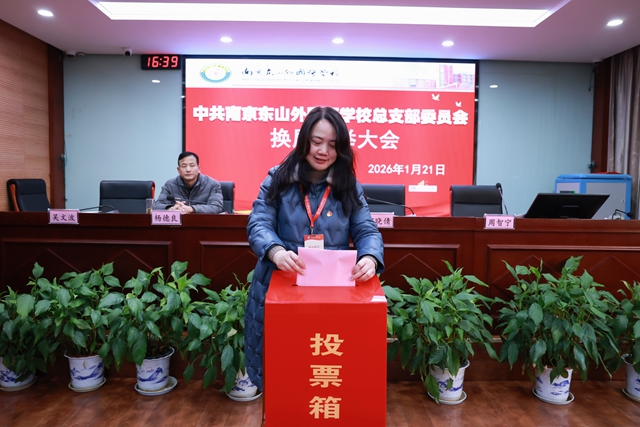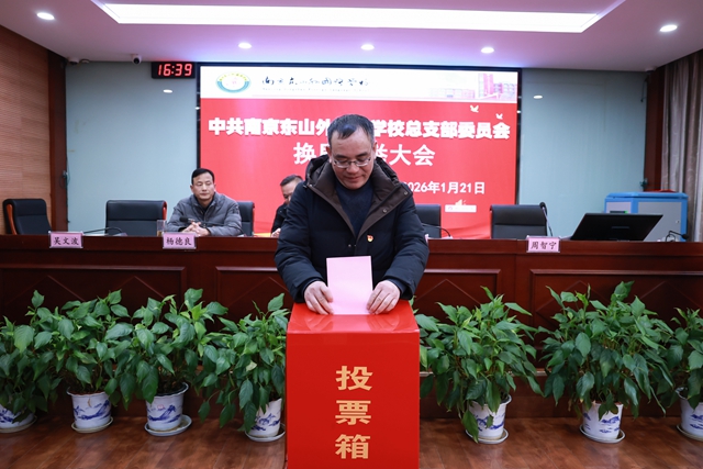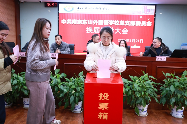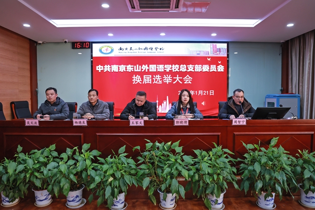 为深入贯彻落实新时代党的建设总要求,严格规范基层党组织选举工作,根据上级党组织统一部署安排,2026年1月21日下午,南京东山外国语学校党总支换届选举大会在第三会议室隆重召开。全校77名党员同志参会,江宁区教育局领导王家文、区教育局党建科科长杨德良莅临指导,大会由校党总支副书记周智宁主持。